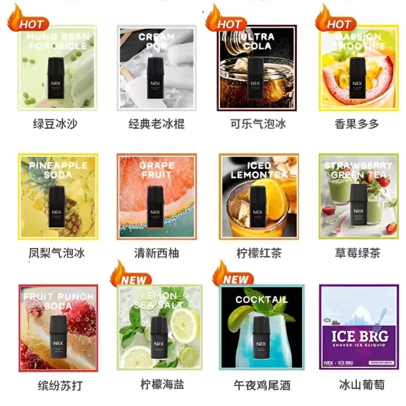 NRX3代原味煙草, NRX3代桲檬海鹽, NRX3代老冰棍, NRX3代百香果, NRX3代薄荷, NRX3代ICE葡萄, NRX3代鐵觀音, NRX3代可樂, NRX3代綠豆, NRX3代水蜜桃, NRX3代西瓜, NRX3代蓝莓, NRX3代凰梨, NRX3代冰山荔枝, NRX3代冰山芒果